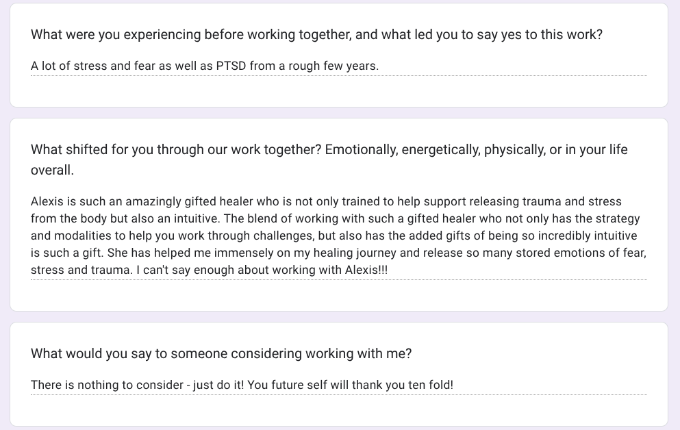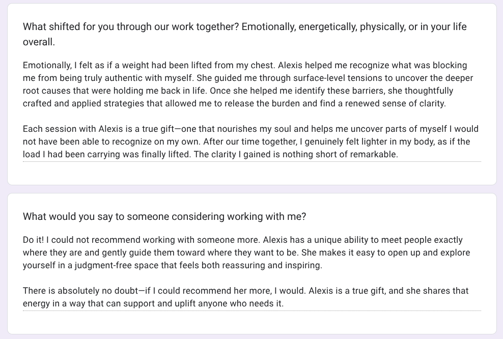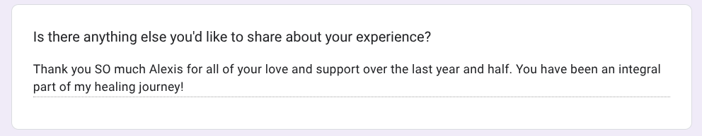 “Alexis creates space where you can be vulnerable with her and with yourself so you can truly get in touch with where you are, where you want to be and how to get there. ”